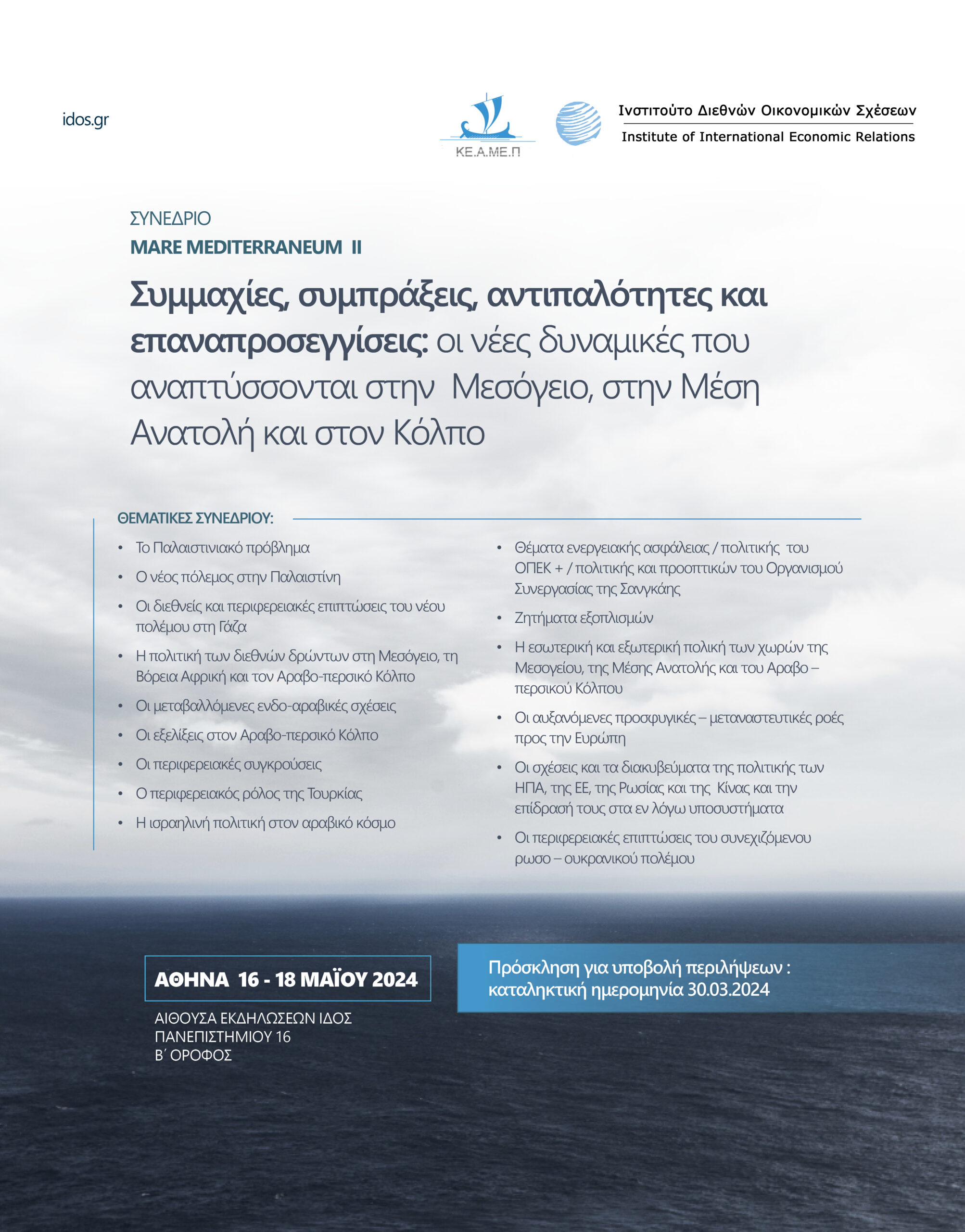 Το Κέντρο Ανάλυσης Μεσανατολικής Πολιτικής (ΚΕ.Α.ΜΕ.Π.) του Ινστιτούτου Διεθνών Οικονομικών Σχέσεων (ΙΔΟΣ) διοργανώνει Συνέδριο με θέμα: